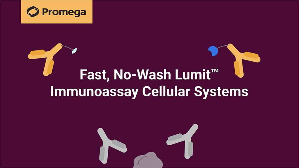 Lumit® Immunoassay Cellular Systems include Lumit® Secondary Antibodies (rabbit and mouse; Lumit® Anti-Goat Antibody conjugates available separately), which are conjugated with NanoBiT® subunits: LgBiT and SmBiT. Binding of the antibody complexes brings LgBiT and SmBiT into close proximity to form an active NanoLuc® luciferase that produces light in proportion to the amount of target analyte.