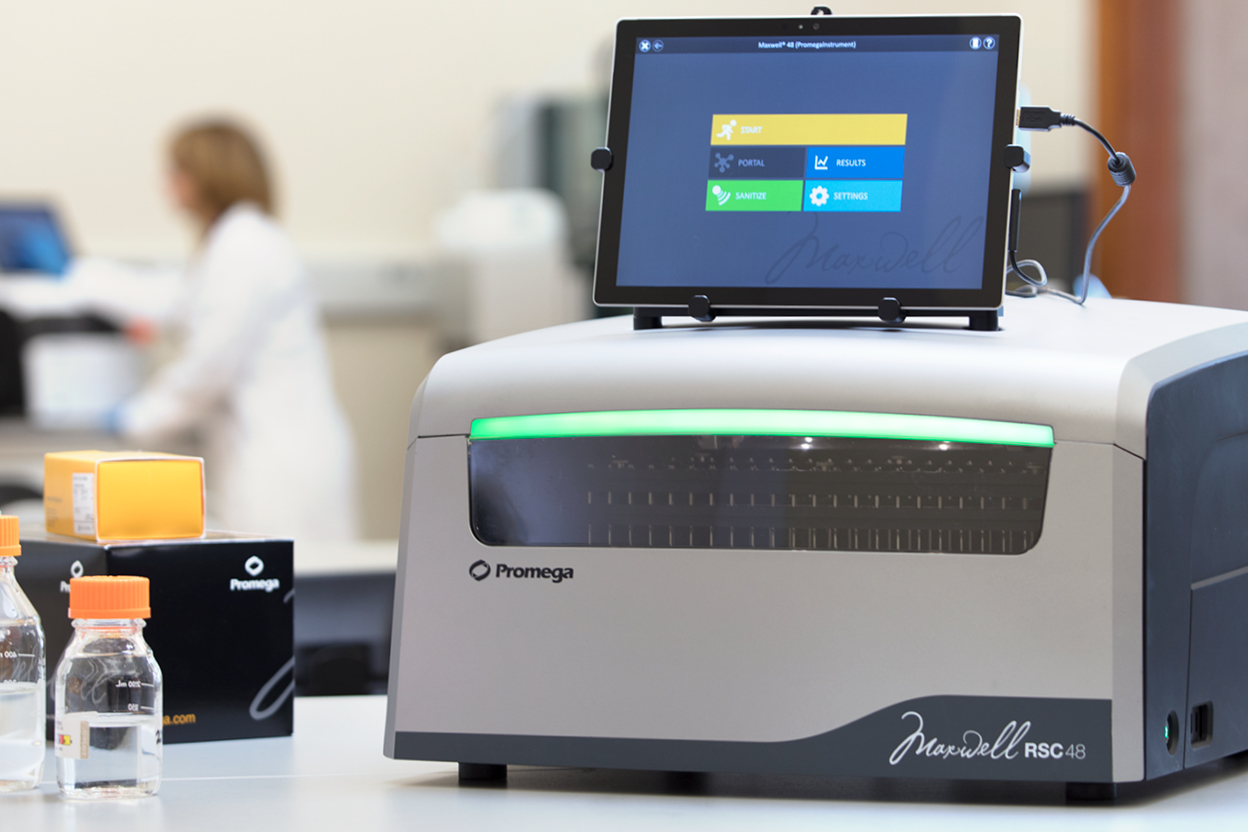 The Maxwell® RSC 48 Instrument is a compact, automated nucleic acid purification platform that processes up to 48 samples simultaneously. Using Maxwell® RSC prefilled cartridges, the Maxwell® RSC 48 Instrument brings the same consistent, reliable purification of DNA or RNA from a variety of sample types and a higher throughput. The intuitive graphical interface makes the instrument easy to use. The integrated vision system with its large LED indicator reduces the potential for user error by detecting proper cartridge placement and lets you know before a run starts if there is an issue. An integrated Bar Code reader makes it easy to track samples.